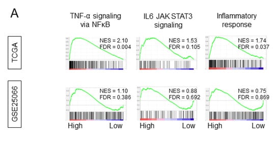 Gene set enrichment analysis (GSEA) was a publicly available software (GSEA version 4.0) provided by the Broad Institute (Cambridge, MA, USA) (http://software.broadinstitute.org/gsea/index.jsp). For GSEA, we utilized Hallmark gene sets used for this study, as previously described [,,,,,,,]. False discovery rate (FDR) of 0.25 was utilized to define the statistical significance of GSEA throughout the study, as the Broad Institute recommends.