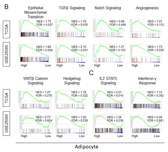 In order to examine whether intratumoral adipocytes demonstrated similar biological functions as previously reported in vitro [], a gene set enrichment assay (GSEA) was performed on the TCGA cohort. In the whole cohort and in both ER+/HER2- and TNBC subtypes, intratumoral adipocyte-high tumors enriched for inflammation-related gene sets: TNF-α signaling via NFκB, IL-6/JAK/STAT3 signaling, and inflammatory response (Figure 3A, Supplementary Figures S3A and S4A). This was concordant with previous reports [,]. The aforementioned gene sets were not enriched in the GSE25066 cohort, which had fewer patients compared with TCGA. We also found intratumoral adipocyte-high tumors enriched for epithelial–mesenchymal transition (EMT), TGFβ signaling, angiogenesis, WNTβ catenin signaling, and Hedgehog signaling in the whole cohort and the ER+/HER2 subtype in TCGA (Figure 3B, Supplementary Figures S3B and S4B). These gene sets reflected on mechanisms of metastasis and cancer stemness. These were also enriched in intratumoral adipocyte-high tumors in the GSE25066 cohort. Only in the ER+/HER2 subtype was intratumoral adipocytes-high tumors enriched for Notch signaling. In the TNBC subtype, only TGFβ signaling was enriched among the metastasis and cancer stemness-related gene sets (Supplementary Figure S4B). On the other hand, intratumoral adipocyte-high tumors enriched for gene sets related to immune response such as IL2 signaling and IFN-γ only in ER+/HER2- subtype in TCGA cohort (Figure 3C, Supplementary Figures S3C and S4C). In the GSE25066 cohort, only IL2 STAT5 signaling was enriched among the immune response gene sets. These results suggest that intratumoral adipocyte-high tumors were associated with inflammation, metastasis, and immune-related gene sets, especially in the ER+/HER2- subtype.
