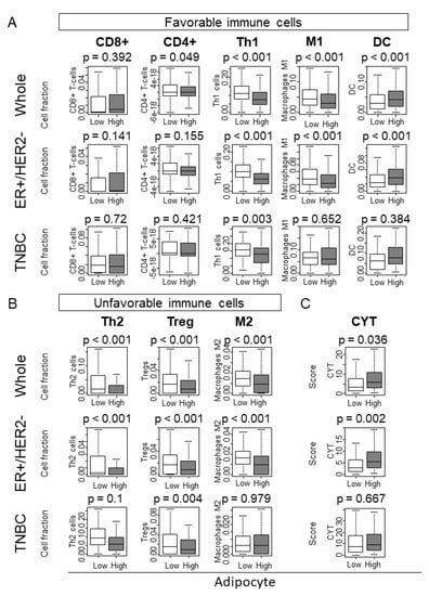 Given the data from the gene set enrichment analysis, we further explored the infiltration of immune cells within the tumor microenvironment using the whole TCGA breast cancer cohort. Regarding favorable immune cells, intratumoral adipocyte high tumors were associated with a high proportion of dendritic cells (DC), but with less with type 1 helper T cells (Th1) and M1 macrophages (M1) in the whole cohort (Figure 4A; all p < 0.001). In terms of unfavorable immune cells, less type 2 helper T cells (Th2), regulatory T cells (Treg), and M2 macrophages (M2) were found in intratumoral adipocyte-high tumors, compared to adipocyte-low tumors (Figure 4B; all p < 0.001). A similar pattern of results was found in the ER+/HER2- subtype, whereas only Th1 and Treg were associated with intratumoral adipocyte-high tumors in the TNBC subtype (Figure 4A,B). The cytolytic activity score (CYT) reflects the cytolytic activity of all the immune cells in the bulk tumor. High CYT was associated with intratumoral adipocyte-high tumors in the whole cohort and in the ER+/HER2- subtype, but not in TNBC subtype (Figure 4C). These results indicated that adipocyte-high tumors were associated with overall favorable tumor immune microenvironment in ER+/HER2- subtype, but not in TNBC.