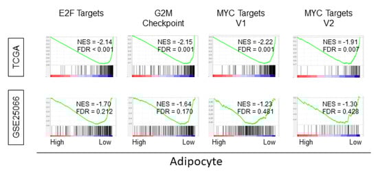 GSEA of adipocyte low tumors enriched Hallmark cell cycle and cell proliferation-related gene sets in whole TCGA cohort. NES, normalized enrichment score; FDR, false discovery rate. FDR < 0.25 was considered statistically significant.