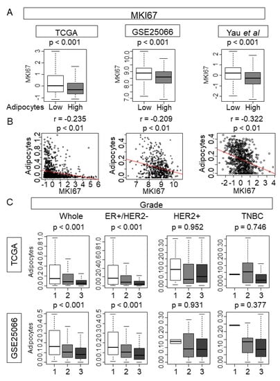 The amount of intratumoral adipocytes correlate with MKI67 expression and Nottingham pathological grade. (A) MKI67 gene expression by intratumoral adipocyte High (shaded box) vs. Low (open box) in whole TCGA, GSE25066, and Yau et al.’s cohort. (B) Pearson correlation curve of MKI67 expression and adipocyte amount in the whole TCGA, GSE25066 and Yau et al.’s cohort. (C) Nottingham pathological grade (grade 1: Open box, grade 2: Shaded box, grade 3: Closed box) and amount of adipocytes in whole cohort and ER+/HER2-, Her2+, TNBC subtype in TCGA and GSE25066 cohort. ER+/HER2-, ER-positive and HER2 negative; HER2+, HER2 positive; TNBC, triple-negative breast cancer. p-value < 0.05 was considered statistically significant. r represents a Spearman’s correlation coefficient.