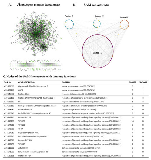 To get deeper insight into the function of immune-enriched genes, we linked SAM-DEGs to their encoded proteins. We contextualized a generic interactome AI (Arabidopsis Interactome) into SAM-interactome by mapping DEGs of all SAM-cellular populations onto the AI. The four defined sectors (Figure 2A) of the SAM-interactome have individual cellular populations that share similarities in their gene expression profile [12]. Nodes of the sub-networks have poor intra-sectoral interactions (edges), as well as sparse intersectoral interaction, among the nodes of Sector I, II, and III have been observed (Figure 2). However, the vast majority of the cross-sectoral interactions happen between the nodes of Sector IV and first three sectors.