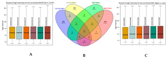 Background correction and normalization of each set is performed separately using the RMA algorithm from the R package “oligo” [26,27,28,29]. A soft intensity-based filtering is applied on the normalized data: lowly expressed genes are filtered out by a threshold of 4 for the median intensities of genes as per the instructions of Klaus et al. [36]. Differential gene expression analysis is performed with R package limma. For each set, contrasts are created (control vs. test), and samples are annotated accordingly. After acquiring a linear model fit for each set, empirical Bayes statistics are implemented to get differential expressed genes (DEGs). The differential expressed genes are filtered against p-value < 0.05 and |log2FC| >1. For transcriptome sets, 301 genes reflecting the protoplasting effect are subtracted [11] from the SAM-cellular population gene expression profile.
