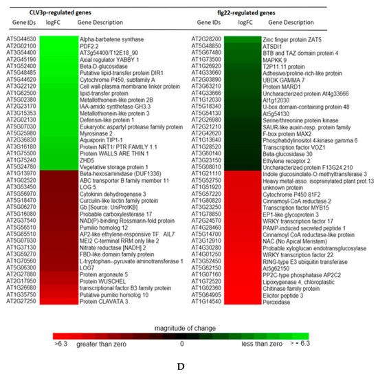 Overlap between the DEGs of CVL3p-expressing cellular populations (stem cells) and flg22-treated mesophyll cells. (A) The GEO acquired raw CLV3p- and CLV3n-expressing SAM cellular microarray datasets, 3-replicates each wild type and mutant with its GEO-Samples (GSM)-identifiers, are statistically normalized. (B) The Flg22 and CLV3p regulated differentially expressed genes (DEGs) are compared and contrasted for co-regulated genes in a Venn diagram (http://bioinfogp.cnb.csic.es/tools/venny/). (C) The raw microarray datasets pertaining the flag22-treated mesophyll cells and mock-treated mesophyll cells were also acquired from GEO and then normalized. (D) Top-20 up- and down-regulated differentially expressed genes from both CLV3p-expressing SAM cell populations (A: left panel) and flg22-treated mesophyll cells (C: right panel) are visualized with the Heatmapper plus tool (http://bar.utoronto.ca/ntools/cgi-bin/ntools_heatmapper_plus.cgi) of the ePlant database. The column information deals with the gene IDs, logFC in term of heatmap, and the annotation of the given genes. The scale bar beneath the columns denotes the magnitude of both up-regulation (red) and down-regulation (green) for the given genes.