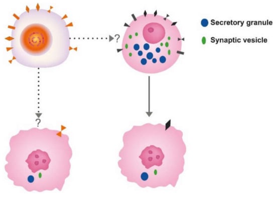 Another view is that tumors may develop from any cell able to divide []. With the accumulation of mutations, the differentiated cell gradually loses specific traits (secretory granules, synaptic markers and receptors leading to cells increasingly different from the cell of origin (Figure 1 and Figure 2).
