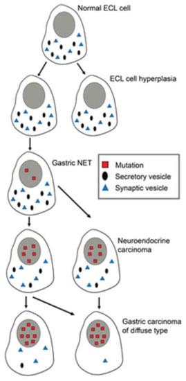 Changes in differentiated ECL cells during tumorigenesis/carcinogenesis with accumulation of mutations, leading to loss of specific markers, making it increasingly difficult to recognize the cell of origin. Reproduced with permission from Waldum HL, Brenna E, Sandvik AK 1998. Relationship of ECL cells and gastric neoplasia. Yale J Biol Med 71; 325–335 [].