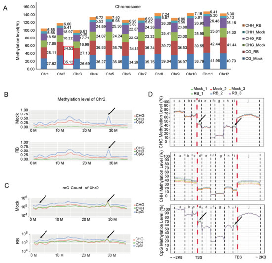 DNA methylation levels throughout the 12 chromosomes were further reviewed. However, the entire chromosomal methylcytosine levels at CG, CHG and CHH site were higher in RBSDV-infected rice than in the controls (virus-free) except the CG site of chromosomes 2 (Chr2) under RBSDV stress (Figure 1A,B). The DNA methylation patterns of virus-free and RBSDV-infected rice were similar (Figure S2), whereas the density profile of methylcytosines in Chr2 of rice was clearly distinguished (Figure 1C). The average methylcytosine levels of gene body and promoter regions were further inspected in different regions of promoter, exon, intron, and downstream sequences, and it was found that, under RBSDV stress, CHG and CG methylation were increased in first exon and last exon regions, respectively. Further analysis showed that the CHH methylation levels in all specific regions were higher in RBSDV-infected rice than in the control (Figure 1D).