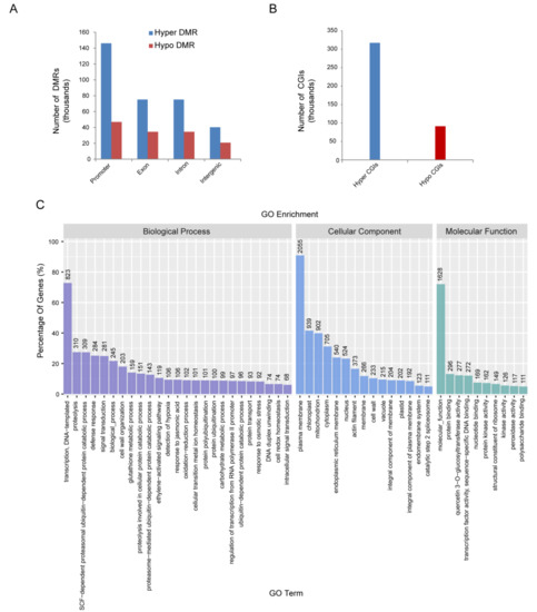 The genomic regions associated with CG, CHG and CHH hypermethylation or hypomethylation were profiled to investigate specific DNA methylation in RBSDV-infected rice. A total of 980,913 non-redundant RBSDV-responsive DMRs were examined (p < 0.05), among which 734,234 were hypermethylated (hyper-DMRs) and 246,679 were hypomethylated (hypo-DMRs). Further analysis showed that DMRs in promoter regions were higher compared to the exon, intron, and intergenic regions (Figure 2A). Methylation of CpG islands (CGIs) at gene promoters has been reported to be associated with the silencing of numerous genes affecting a variety of vital cellular processes [28,29]. We observed a total of 408,352 CGIs (317 053 hypermethylated and 91,299 hypomethylated, respectively) (Figure 2B). There were more hypermethylated genes than hypomethylated genes which was consistent with the previous studies [15]. The DMR-associated genes obtained according to differential methylation statistics in 2000 regions upstream of the transcription start site of the gene were classified into three groups according to biological process, cellular component and molecular function based on rice GO annotation information. High clusters pointed to transcription, DNA-templated as biological process, plasma membrane as cellular component, and molecular function as the molecular function group (Figure 2C).
