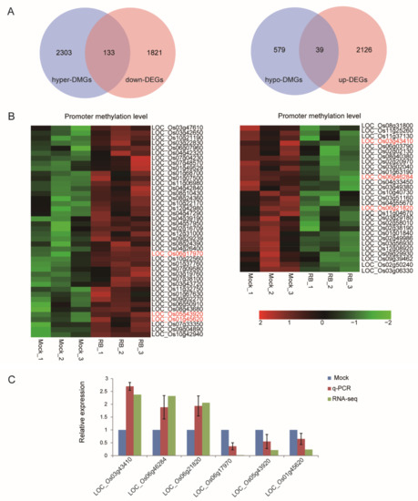 Modulation of DNA methylation in promoters represents a potential mechanism to adjust plant gene expression following exposure to different stresses [30]. To maximize genes regulated by the methylation on promoter regions, the threshold of DMRs-associated genes and DEGs was adjusted to a p-value < 0.05. We identified 2964 promoter DMR-associated genes (2436 hyper-DMGs, 618 hypo-DMGs) and 4118 DEGs (2164 up-regulated, 1954 down-regulated). Cross analysis of DMGs and DEGs showed that 125 hyper-DMGs were up-regulated at the transcriptional level and 26 hypo-DMGs were down-regulated (Figure S4A), whereas 39 hypo-DMGs were up-regulated at the transcriptional level and 133 hyper-DMGs were down-regulated (Figure 4A). We limited to DEGs with a 1.5-fold change of the up-regulated genes and 2-fold change of the down-regulated genes, allowing only 102/71 genes with positive/negative correlation between DMGs and DEGs upon RBSDV infection to be filtered (Supplementary Data S1 and Supplementary Data S2). The heatmap revealed a different DNA methylation level in promoter regions of 102 genes (87 hyper-up, 15 hypo-down) with positive correlation (Figure S4B) and 71 genes (29 hypo-up, 42 hyper-down) with negative correlation between DMGs and DEGs (Figure 4B). Many studies focus on the negative correlation between DNA methylation status in promoters and gene expression in plant for its crucial roles during different growth stages and under stress conditions [28,31,32]. Many of the 71 genes were involved in biosynthesis of amino acids, plant-pathogen interaction, plant hormone signal transduction and protein processing in endoplasmic reticulum pathways (Figure S3). Accordingly, six representative genes for four KEGG pathways were further selected for transcript analysis by RT-qPCR. Among these were, LOC_Os03g43410 (OsIAA12-Auxin-responsive Aux/IAA gene family member, expressed), LOC_Os05g43920 (auxin response factor 14, putative, expressed) and LOC_Os01g45620 (CGMC_MAPKCMGC_2.5-CGMC includes CDA, MAPK, GSK3, and CLKC kinases, expressed) involved in KEGG pathways of Plant hormone signal transduction; LOC_Os06g17970 (NBS-LRR disease resistance protein, putative, expressed) involved in KEGG pathway of Plant-pathogen interaction; LOC_Os06g46284 (glycosyl hydrolase, family 31, putative, expressed) involved in KEGG pathway of Galactose metabolism; and LOC_Os06g21820 (jasmonate O-methyltransferase, putative, expressed) involved in KEGG pathway of α-linolenic acid metabolism. LOC_Os03g43410, LOC_Os06g46284 and LOC_Os06g21820 were hypomethylated and up-regulated at the transcriptional level, while LOC_Os06g17970, LOC_Os05g43920 and LOC_Os01g45620 were hypermethylated and down-regulated. RT-qPCR results were consistent with RNA-seq data (Figure 4C). All of them showed a negative correlation between methylation level and gene expression, indicating that these genes may be modified by DNA methylation.