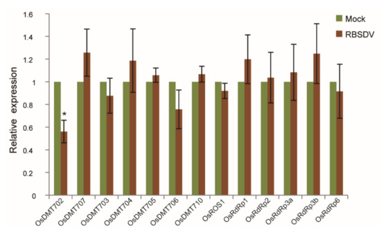 In addition, five RNA-dependent RNA polymerase (RDR) protein genes, including OsRDR1 (Os02g50330), OsRDR2 (Os04g39160), OsRDR3a (Os01g10130), OsRDR3b (Os01g10140) and OsRDR6 (Os01g34350) which are required for RNA-directed DNA methylation, have been identified in rice [36]. RT-qPCR was performed to analyze their expression abundance under RBSDV stress. The expression level of OsDMT701, OsDMT708 and OsDMT709 were too low to be detected. Expression of OsDMT702 was significantly repressed in RBSDV-infected rice, while expression of OsDMT704, OsDMT707, OsRDR1 and OsRDR6 was weakly enhanced. OsDMT706 was slightly reduced, and no significant change was detected in the expression level of the remaining genes (Figure 5). These results indicate that RBSDV altered the expression of some key genes maintaining DNA methylation of rice to different extent.