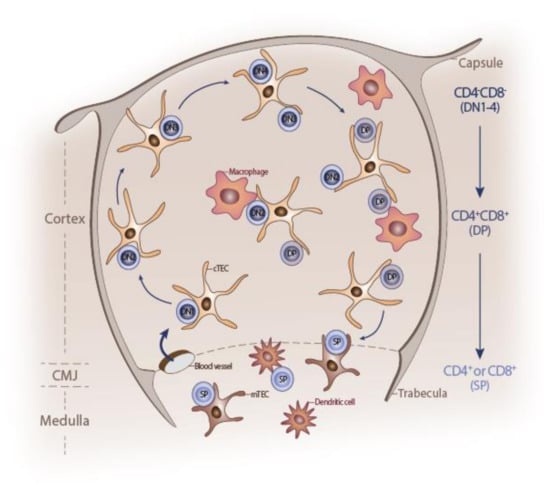 In young individuals, the thymus contains large numbers of developing lymphoid progenitor cells (LPCs) embedded in a three-dimensional (3D) network of thymic stroma [8]. This multi-component stroma is comprised of a majority of thymic epithelial cells (TECs), dendritic cells, endothelial cells, macrophages, and fibroblasts [9]. The intricate 3D network allows close proximity between the developing LPCs and TECs. TECs exhibit different morphology and gene expression profiles, and provide migratory cues (through the expression of several chemokines) to LPCs’ homing, as well as to the migration of the developing lymphoblasts across the distinct thymic compartments (reviewed in [10,11,12,13,14,15]). TECs subsets also provide distinct microenvironmental niches and signals essential for proper thymocyte differentiation (reviewed in [11,13,16,17]). Cortical TECs are required for commitment, expansion, and positive selection of thymocytes to recognize self-MHC [18], whereas medullary TECs support negative selection, which eliminates potentially autoreactive T-cells, thus, inducing self-tolerance [19] (Figure 1) (reviewed in [20,21,22]).