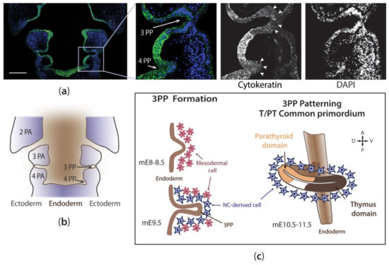 The single endodermal germ layer origin of the thymic epithelium (TE) was first demonstrated using the quail-chick chimera system [23]. In chicken, the TE derives from the endoderm of the 3rd and 4th pharyngeal pouches (3/4PP; Figure 2a) [23,24], while in mammals, it derives from the 3PP endoderm (3PP) [25]. The PP are bilateral outpockets of the endoderm, which are in contact with the ectoderm invaginations (the pharyngeal clefts), separating the different pharyngeal arches (PA) (Figure 2b). The PA are composed of a mesodermal core enclosed by NC-derived mesenchyme, an outer ectodermal cover, and an inner endodermal lining (reviewed in [26]).