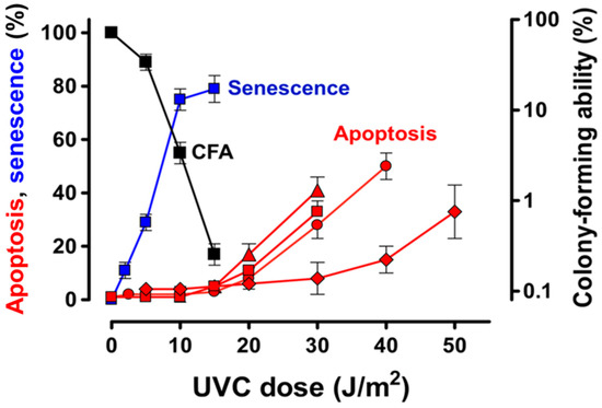 Dose-response curves for loss of colony-forming ability, apoptosis and therapy-induced cell senescence (TCS) in normal human fibroblasts following exposure to increasing doses of ultraviolet light-C (UVC) (254 nm): (■) Colony-forming assay (CFA) data for GM38 cells [49]; (■) UVC-induced TCS in GM38 cells at 7 days after UVC exposure based on the number of cells that retained viability, exhibited flattened and highly enlarged morphology, and were positive for senescence-associated β-galactosidase activity [62]; (●) UVC-induced apoptosis in 2525T cells based on the flow cytometric sub-diploid DNA content assay [49]; (■) UVC-induced apoptosis in GM38 cells based on flow cytometric determination of Annexin V-positive (phosphatidylserine externalized) cells [62]; (♦) UVC-induced apoptosis in primary 293T fibroblasts based on the Annexin V assay [65]; and (▲) UVC-induced apoptosis in AG1522 fibroblasts based on sub-diploid DNA content [64]. All apoptosis data were assessed at 72 h after UVC exposure.