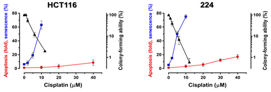 Dose-response curves for loss of colony-forming ability and for the induction of apoptosis and therapy-induced cell senescence (TCS) in HCT116 (colon carcinoma) and 224 (melanoma) p53-WT human tumour cells treated with increasing concentrations of cisplatin for 6 h. (▲) colony-forming ability assayed at 10 days posttreatment, (●) apoptosis based on caspase-3 activation assayed at 14 h posttreatment, and (■) TCS based on a combination of senescence-associated β-galactosidase activity and PKH2 staining assayed at 6 days posttreatment. Data from Berndtsson et al. [69].