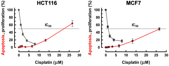 As with UVC, described above, it is apparent from selected studies that used a broad range of cisplatin and oxaliplatin concentrations that span the low/clinically-relevant all the way through to high/supralethal ranges and that used assays that report on numbers of cells affected (rather than cell population-averaged assays) that there is again a distinct apoptotic threshold for these drugs, typically at approximately 10 μM. The necessity for using much higher concentrations of cisplatin or oxaliplatin to demonstrate cancer-cell apoptosis versus loss of clonogenic potential has been reported by many laboratories (e.g., [73,74,75,76,77]). Berndtsson et al. [69] confirmed the threshold nature of the apoptotic response in p53-WT HCT116 colon carcinoma and 224 melanoma cells exposed to cisplatin for 6 h, with significant levels of apoptosis only being seen after much higher cisplatin concentrations (threshold at approximately 10 μM) than those used in the CF assay, as shown in Figure 3. Figure 4 shows similar data from our laboratory with p53-WT MCF7 and HCT116 cancer cells after treatment with cisplatin for 2 h [63]. Both cell lines exhibited significant levels of apoptosis, but only after concentrations above a threshold at approximately 10 μM cisplatin, i.e., again above the range where the companion 3-day proliferation inhibition experiments were done. However, there are exceptions to this behavior, and some solid tumour-derived cell lines do exhibit manifestations of apoptosis after lower concentrations of cisplatin (e.g., [78,79]). From the future cancer therapy perspective, this is an important consideration that we will return to in Section 5.