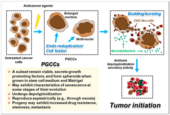 Cartoon illustrating the generation and fate of polyploid giant cancer cells (PGCCs). Cancer cells (top, left) stressed by factors such as anticancer agents or hypoxia can undergo a complex series of adaptations, including endoreduplication and cell fusion, that result in the emergence of PGCCs with either a highly enlarged nucleus or multiple nuclei. PGCCs may contribute to tumour repopulation following cancer therapy by at least three mechanisms: (i) depolyploidization through undergoing a complex genome reduction process, mediated by key regulators of mitosis, meiosis and self-renewal, ultimately giving rise to para-diploid progeny (i.e., containing a near-diploid number of chromosomes) that exhibit recovery of proliferative capability; (ii) depolyploidization by amitotic processes (e.g., neosis), involving budding and bursting (nuclear fragmentation) similar to prokaryotes and unicellular eukaryotes, to generate tumour initiating cells with cancer stem cell (CSC)-like properties; and (iii) secretion of factors that create a permissive tissue microenvironment for tumour growth and progression. Some features of PGCCs are listed in the left lower box. For details, please consult [85,87,88].