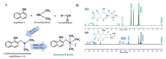(I) Synthesis route for quaternized moiety (QM). (II) 1H NMR spectra of (a) 2-[dimethylaminomethyl]naphthalen-1-ol and (b) quaternized 2-[dimethylaminomethyl]naphthalen-1-ol.