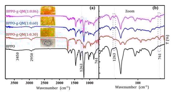 The quaternized ammonium (QA) groups inside the membrane core developed during grafting were confirmed by the FTIR-ATR and results displayed in Figure 2. The commensurate study of the spectra of the BPPO, BPPO-g-QM (1:0.30), BPPO-g-QM (1:0.60), and BPPO-g-QM (1:0.86) membranes showed a medium absorption band around at 761 cm−1, which is ascribed to the C-N stretching vibration for the QA groups []. This band is unquenchable in the BPPO spectrum and manifested in Figure 2b. Most importantly, those outlines showed a preference for the characteristic peak of the QA groups. An absorption peak for the C-N stretching vibration of QA groups was observed at around 1263 cm−1, but it was absent in the BPPO. Meanwhile, an absorption peak at around 2950 cm−1 was facilitated by -CH3 functional groups. A broad absorption peak was detected at around 3450 cm−1 in the FTIR-ATR results, which was missing for BPPO. This defines the stretching vibration of 0-H bands due to the presence of water in the AEMs [].
