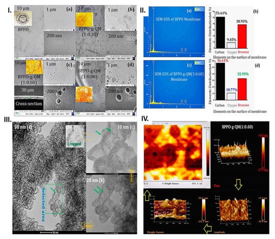 SEM was used to view the assembly of tiny microscopic phenomena. The surface images were distinguished from each other (see Figure 3I and, individually, Supplementary Figures S9–S12). Furthermore, SEM-EDS was performed for measuring the surface element distribution of the BPPO and BPPO-g-QM (1:0.60) membranes, as shown in Figure 3II. As concluded, the percentage of carbon and oxygen elements was increased; meanwhile, the bromine element content was decreased. The surface images showed that the enrichment effect of the QM content in the MM induced by the grafting through the TIPS occurred and that no holes or cracks were present. Scanning Probe Microscopy (SPM) was performed for the phase resolution, consisting of using a height sensor, determining the trapping roughness of the BPPO-g-QM (1:0.60) membrane, and producing a clear phase image, shown in Figure 3IV. The QM created an impression on the BPPO polymer’s morphology and increased the porosity, the roughness, the peak height, and a number of the peaks as well (see Figure S14).