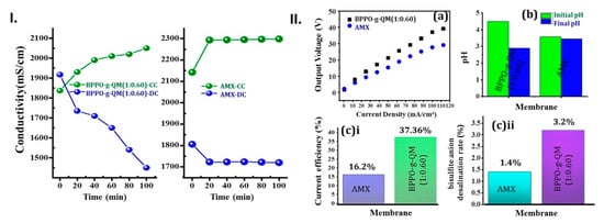 (I) Conductivity vs. Time plot in NaHSO3 solution at room temperature during ED. (II) (a) the potential difference of quaternized membrane BPPO-g-QM (1:0.60) and Neosepta (AMX) over stack during ED; (b) Changing pH of diluted cell; (c)i and (c)ii, the current efficiency and bisulfite anion desalination rates, respectively.