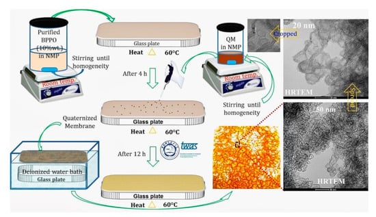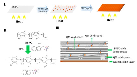 For the polymeric membrane, the TIPS and DIPS techniques were used. The membrane morphology, nascent porosity, and surface formation are affected by the thermodynamics of the polymer solution []. TIPS is one of the leading procedures to afford microporous membranes. Herein, a de-mixing process occurs in phase inversion. The schematic invention of the BPPO-g-QM membrane is shown in Figure 5. The schematic membrane formation grafting through QMs is shown in Figure 6 and Figure 7II.