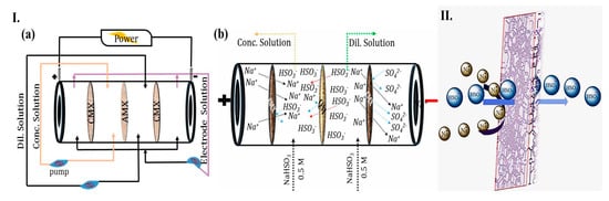 (I) (a) Schematic setup of ED stack separation and (b) mechanism. (II) 3D scheme for bisulfite anion separation.