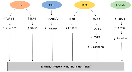 Representation of the metabolites and related pathways involved in the Epithelial-Mesenchymal transition (EMT) process in cancer. Lipopolysaccharide (LPS) has been shown to promote EMT through the upregulation of transforming growth factor beta-1 (TGFβ-1) and Mothers Against Decapentaplegic Homolog 2/3 (Smad2/3) [22] as well through the increased expression of Toll Like Receptor 4 (TLR4) and NF-KB [23] in biliary epithelial cells. Conversely, Cadaverine (CAD) can inhibit EMT in breast cancer cell lines through the activation of trace amino acid receptors 8 and 9 (TAAR8/9) modulating the expression of metalloproteinase 9 (MMP9) [29]. In breast cancer cell lines, inhibition of EMT can be carried out through the metabolic pathway of short chain fatty acids (SCFAs) that activates Free Fatty Acid Receptor 2 (FFAR2), leading to inhibition of the Hippo-Yap pathway and increased expression of adhesion protein E-cadherin, and FFAR3, resulting in mitogen-activated protein kinase (MAPK) signaling inhibition [30]. Finally, acetate can promote EMT by increasing the expression of the zinc finger protein Snail Family Transcriptional Repressor 1 (SNAI1) and Acyl-CoA Synthetase Short Chain Family Member 2 (ACSS2) in renal carcinoma cells under glucose limitation [31].