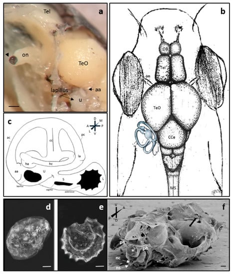 - Bang, P.I.; Sewell, W.F.; Malicki, J.J. Morphology and cell type heterogeneities of the inner ear epithelia in adult and juvenile zebrafish (Danio rerio). J. Comp. Neurol. 2001, 438, 173–190. [Google Scholar] [CrossRef]