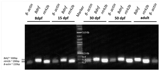 - Cacialli, P.; Gueguen, M.-M.; Coumailleau, P.; D’Angelo, L.; Kah, O.; Lucini, C.; Pellegrini, E. BDNF expression in larval and adult zebrafish brain: Distribution and cell identification. PLoS ONE 2016, 11, e0158057. [Google Scholar] [CrossRef]