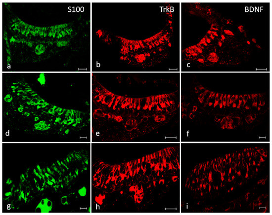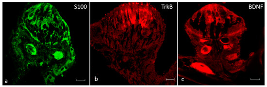 4.4. Localization of BDNF, TrkB and S100 Protein Using Single and Double Immunofluorescence Staining