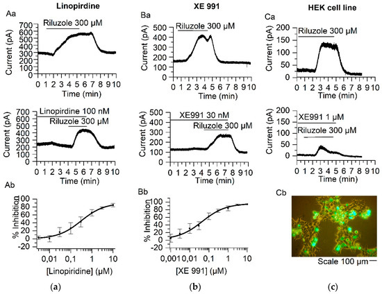 Inhibition of IRIL by linopirdine and XE991 in SCG (superior cervical ganglion) neurons and in HEK293. (A) Inhibition of IRIL by linopirdine 100 nM (concentration close to the IC50; (Aa)). Dose–response curve for the inhibition of IRIL by linopirdine (concentrations (µM) = 0.003, 0.01, 0.03, 0.1, 0.3, 1, 3, 10) showing an IC50 of 0.310 ± 0.06 µM (Ab). (B) Inhibition of IRIL by XE991 30 nM (concentration close IC50; (Ba)). Dose–response curve for IRIL inhibited by XE991 (concentrations (µM) = 0.001, 0.003, 0.01, 0.03, 0.1, 0.3, 1, 3, 10) resulting in an IC50 of 0.044 ± 0.013 µM (Bb). (C) The riluzole-evoked current in HEK293 cells was strongly suppressed by 1 µM XE991 (Ca). HEK293 cells transfected with TREK-2 channels (Cb).