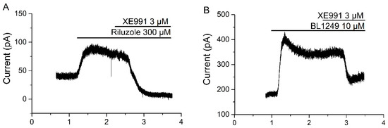 In addition, XE991 was applied upon the maximal effect of riluzole in SCG neurons in order to corroborate the effect of XE991 directly on riluzole-activated current. As reported before, activation of TREK-1 and TREK-2 currents by riluzole is often biphasic and the activation is transient [22]; however, the effect of XE991 (3 µM) was so strong that it was easily measured (Figure 2A). In our hands riluzole induced an outward current of 125.47 ± 52.93 pA (IRIL, n = 4) and we considered the XE991 inhibitory effect as an inward current (IXE991 = −121.66 ± 66.87 pA, n = 4). Similar experiments were designed using another TREK current activator, BL1249 [24]. The application of BL1249 10µM provoked an outward current of 82.41 ± 27.07 pA (IBL; n = 4). On the maximal effect of BL1249, we applied XE991 (3µM) that provoked an inward current of −67.26 ± 18.73 pA (n = 4), Figure 2B.