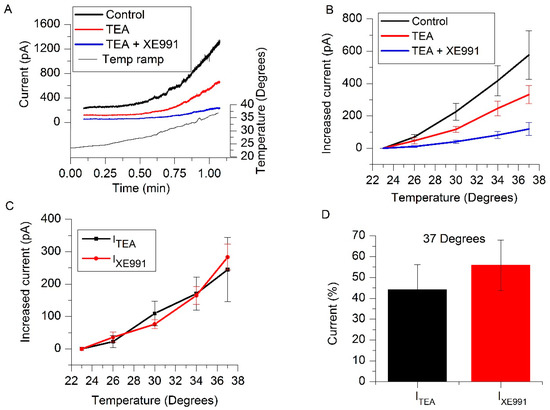 Increase of ITEA and IXE991 by temperature rise in SCG (superior cervical ganglion) neurons. (A) Example of current increases in control (black trace), in presence of TEA (15 mM, red trace) and in the presence of TEA + XE991 (3 µM) (blue trace), produced by a temperature rise at 0.23 °C/s (black thin trace) from 23 °C to 37 °C in one SCG neuron. (B) Increase of the same currents when the temperature was raised from 23 °C to different temperatures (26, 30, 34 and 37 °C; n = 5). (C) Variations of the subtracted ITEA (Control-TEA) and IXE991 (TEA-(TEA + XE991)) currents with temperature (p = 0.29, n = 5). (D) Percentages of ITEA and IXE991 activated at 37 °C were 44.19 ± 12.07% and 55.81 ± 12.07% respectively.