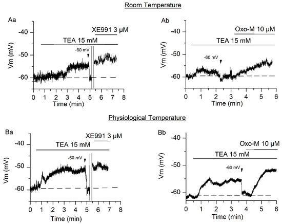Similar experiments were performed at physiological temperature (37 °C). In this case, the application of TEA (15 mM) provoked a depolarization of 5.99 ± 0.73 mV (p < 0.001, n = 13, Figure 4B). Still in the presence of TEA, the application of XE991 (3 µM) caused a depolarization of 7.45 ± 1.99 mV (p < 0.05, n = 4, Figure 4Ba), while the application of oxo-M in the same conditions depolarized 9.29 ± 1.13 mV (p < 0.001, n = 7, Figure 4Bb).