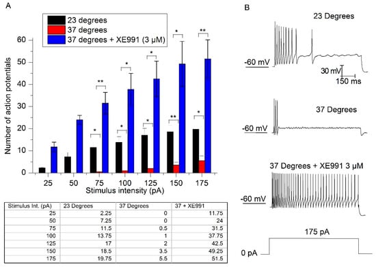 XE991 reduces adaptation at physiological temperatures in SCG (superior cervical ganglion) neurons. (A) Number of action potentials in response to different intensities at 23 °C (black bars), 37 °C (red bars) and 37 °C with XE991 (blue bars), (* p < 0.05, ** p < 0.01, n = 5). (B) Spike firing in response to 175 pA current-injection at 23 °C, 37 °C and 37 °C with XE991. The membrane potential was manually settled to −60 mV. The table shows the number of action potentials at different currents injected at 23 °C, 37 °C and 37 °C with XE991.