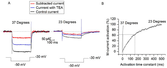 Opening and closing time constants for ITEA in SCG (superior cervical ganglion) neurons. (A) Voltage-steps from −30 to −50 mV allowed us to first deactivate and then activate the M-current. The current in the presence of TEA (15 mM) (black trace) was subtracted from the control (blue trace) to obtain ITEA (red trace). (B) The activation time constant for ITEA decreased from 157.43 ± 12.62 to 7.18 ± 1.90 ms when the temperature was increased from 23 to 37 °C (n = 9).