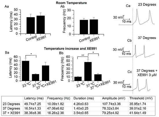 Effect of temperature and XE991 on the action potential parameters in SCG (superior cervical ganglion) neurons. (A) Latency (Aa) and frequency (Ab) do not change with the application of XE991 (3 µM, n = 7) at room temperature. (B) The latency to the first action potential decreased significantly (p < 0.05, n = 5) with the increases of temperature. Posterior application of XE991 (3 µM) provoked no significant change (p = 0.072, n = 5) (Ba). On the contrary, the early spike frequency was significantly increased (p < 0.01, n = 7) with increases of temperature and this increase was countervailed with XE991 (3 µM, p < 0.05, n = 5) (Bb) (* p < 0.05, ** p < 0.01). (C) Representative traces of spike firing in response to 175 pA current-injection at 23 °C (Ca), 37 °C (Cb) and 37 °C with XE991 (Cc) and the membrane potential fixed at −60 mV. The table shows latency, frequency of two first spikes, spike duration, amplitude and threshold at the first spike in response to 175 pA current-injection at 23 °C, 37 °C and 37 °C with XE991.