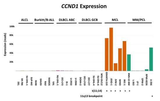 - Caeser, R.; Di Re, M.; Krupka, J.A.; Gao, J.; Lara-Chica, M.; Dias, J.M.L.; Cooke, S.L.; Fenner, R.; Usheva, Z.; Runge, H.F.P.; et al. Genetic modification of primary human B cells to model high-grade lymphoma. Nat. Commun. 2019, 10, 4543. [Google Scholar] [CrossRef]