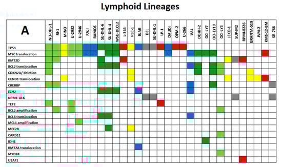 We will limit our presentation of the utility of the LL-100 panel sequencing data on certain exemplary aspects. Selected mutational spectra of lymphoid and myeloid LL cell lines are shown as key examples in Figure 3A,B in the form of mosaic plots of mutant genes and chromosomal aberrations.