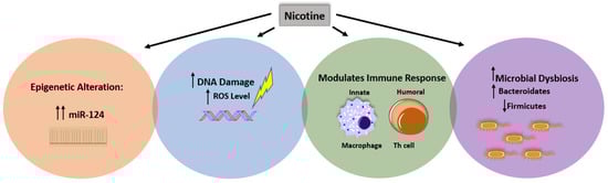 Despite the extensive studies about the involvement of nicotine in IBD pathogenesis, the mechanisms by which nicotine modulates immune response in CD and UC require more elucidation. We propose that these mechanisms require a multi-factorial interaction between nicotine and the immune system, dysbiosis leading to infection, or are epigenetic, as illustrated in Figure 1.