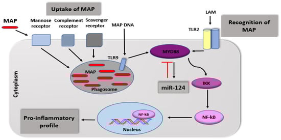 MAP is an intracellular pathogen capable of modulating the innate immune response in CD leading to significant production of pro-inflammatory cytokines [7]. It was reported that monocytes and macrophages in CD patients express toll-like receptor (TLR) at higher levels compared with UC patients [59]. TLRs are pattern recognizing receptors in innate immune cells where the cytoplasmic domain is linked to myeloid differentiation primary response-88 (MYD-88). The latter activates transcription factors such as NF- ҝB to produce pro-inflammatory cytokines. Although there are at least 10 types of TLR, TLR2 binds to MAP through the cell wall lipoarabinomannan (LAM), which initiates the activation of the NF-ҝB pathway and production of pro-inflammatory cytokines [60]. Different types of receptors are responsible for MAP uptake, such as scavenger and mannose receptors as well as complement receptors, which are mainly responsible for internalizing opsonized MAP. TLRs are considered the sole receptors for immune response and activation of the pro-inflammatory pathway by recognition of lipoarabinomannan in the surface of macrophages mimicking CD macrophages. Figure 2 shows illustration of how MAP and its cell wall components interact with TLR during phagocytosis and inflammatory response.
