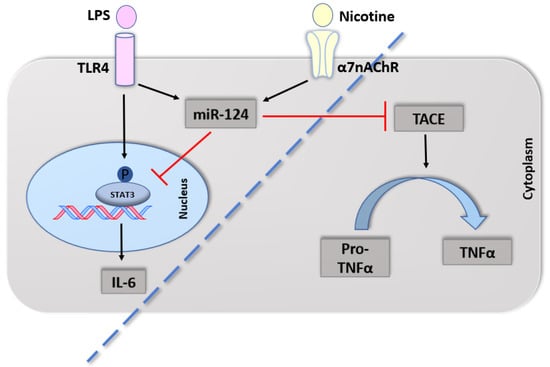 Nicotine activates the anti-inflammatory response in UC macrophages. Nicotine through its receptor, α7nAChR, upregulates miR-124 in LPS-induced macrophages. MiR-124 in turn targets phosphorylated STAT3 and decreases production of IL-6 at the transcriptional level. Meanwhile at the post-transcriptional level, miR-124 blocks TACE, resulting in interruption of TNFα maturation mimicking UC macrophages. Interrupted line to separate cytoplasmic event from nucleic one. STAT3: Signal transducer and activator of transcription 3, TACE: Tumor necrosis factor (TNF)-alpha converting enzyme.