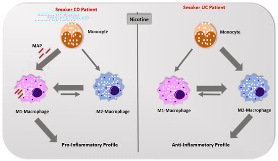 Cigarette smoke (CS) has adverse effects in patients with Crohn’s disease (CD), an inflammatory bowel disease (IBD) that has been associated with microbial infection, immuno-dysregulation, and mucosal dysfunction. However, CS seems to provide relief and protection to patients with another IBD known as ulcerative colitis (UC). These two subsets are featured as M1- and M2-mediated responses, respectively. Nicotine is the most active, addictive, and studied ingredient in CS. The mechanism of how nicotine and/or other CS ingredients induce pro-inflammatory or anti-inflammatory phenotypes in IBD patients remains under investigation. Our most recent in vitro nicotine study provided significant insights toward understanding the contradictory effects of nicotine on IBD patients, and it elucidated the mechanistic role of α7nAChR in modulation of macrophages in tobacco smokers. Shifting the beneficial effect of nicotine to a harmful outcome in CD patients was linked to a nicotine-microbe interaction that supports a microbial etiology in CD pathogenesis. Among the most debated pathogens in CD etiology is Mycobacterium avium subspecies paratuberculosis (MAP). Other studies associated nicotine with upregulation of miR-124 expression in macrophages, which led to anti-inflammatory response. This review discusses published work on the role of nicotine in modulation of the innate immune response and subsequent signaling in macrophages in IBD subsets.