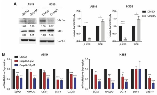 IKKβ targeting reduces the expression of stemness-associated genes in KRAS-mutant lung cancer cells. (A) Western blotting of A549 and H358 cells treated with 0.1% DMSO or 5 µM Compound A (CmpdA) for 30 min. Antibodies were used as indicated. Nitrocellulose membrane was cut before probing with the respective primary antibody and full membrane blots are presented in Figure S2. Representative western blots are shown. Protein bands were quantitated and normalized to the reference samples (0.1% DMSO-treated samples) using Image J software. (B) A549 and H358 cells were treated with 0.1% DMSO or the indicated concentrations of CmpdA for 48 h and expression of SOX2, OCT4, NANOG, BMI1, and CXCR4 was evaluated by qRT-PCR using β-ACTIN as endogenous control. Bar graphs represent average ±1 SD of three independent experiments (n = 3). Statistical significance was determined by one-way ANOVA with a post hoc Turkey test. (* p < 0.5, ** p < 0.01, *** p < 0.001, **** p < 0.0001) by comparing CmpdA-treated groups with the DMSO-treated group.