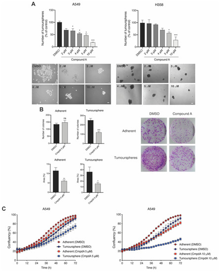 After determining that IKKβ promotes the expression of stemness-related genes, we sought out to investigate how IKKβ would affect TIC function. For that purpose, we treated A549 and H358 cells with CmpdA and analysed tumoursphere formation and TIC proliferation. We found that CmpdA reduced the ability of A549 and H358 cells to form tumourspheres in a dose-dependent manner (Figure 3A). This reduction in tumoursphere formation is not caused by cell death, as CmpdA treatment did not significantly increase A549 or H358 cell death (Figure S3A). Moreover, whereas CmpdA treatment did not affect the ability of adherent A549 cells to form colonies, it decreased colony formation of A549 tumoursphere-derived TIC-enriched cells by half (Figure 3B). It is noteworthy that, even though CmpdA did not affect the number of colonies formed by adherent A549 cells, it did affect colony size (Figure 3B). This can be explained by the fact CmpdA leads to a dose-dependent reduction in A549 proliferation (Figure S3B). In accordance, whereas CmpdA treatment of adherent A549 cells led to a dose-dependent decrease in proliferation, resulting, after 72 h, in a 4% reduction at 5 µM CmpdA and a 16% reduction at 10 µM CmpdA respectively (Figure 3C), CmpdA treatment of A549 tumoursphere-derived cells led to a much more pronounced decrease in proliferation, resulting, after 72 h, in a 16% reduction at 5 µM CmpdA and a 45% reduction at 10 µM CmpdA respectively (Figure 3C). These results indicate that IKKβ targeting preferentially impairs proliferation of TIC-enriched KRAS-mutant cells.