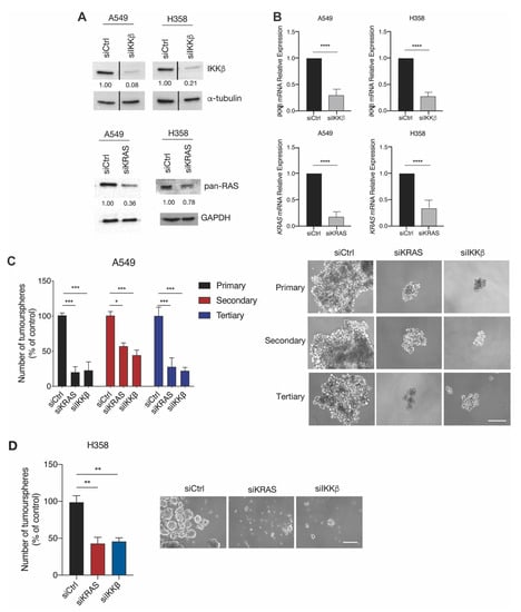In order to evaluate the impact of IKKβ targeting on TIC self-renewal, we targeted IKKβ in A549 and H358 cells by small interfering RNA (siRNA)-mediated transfection and evaluated the ability of targeted cells to form tumourspheres in serial passages. As can be seen in Figure 4A, IKKβ or KRAS targeting by siRNA-mediated transfection resulted in a 92% and 79% reduction in IKKβ protein expression and a 64% and a 22% in reduction in RAS protein expression in A549 and H358 cells, respectively (Figure 4A and Figure S4). This reduction in protein expression was associated with a 70% and 63% reduction in IKKβ mRNA expression, and an 81% and a 71% in reduction in KRAS mRNA expression in A549 and H358 cells, respectively (Figure 4B). The lower reduction of KRAS observed at the protein level compared to the mRNA level stems from the fact that the antibody used to detect KRAS also detects the NRAS and HRAS isoforms, which are not targeted by the siRNA used. Taken together, these results indicate that our siRNA targeting approach was successful.