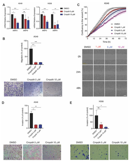 IKKβ kinase targeting with Compound A reduces the expression of matrix metalloproteinase genes, tumour cell migration and invasion. A549 and H358 cells were treated with 0.1% DMSO or the indicated concentrations of CmpdA. (A) After 24 h, expression of MMP2 and MMP9 was evaluated by RT-qPCR using β-ACTIN as endogenous control. (B) After 24 h, transwell migration assays were performed as described in methods. Images shown are representative of three independent experiments (n = 3). White scale bar represents 100 µm. (C) Real-time wound healing assays of A549 cells were performed by IncuCyte time-lapse video microscopy over 72 h of treatment with 0.1% DMSO or the indicated concentrations of CmpdA. Results are expressed as percentage of confluence in the wound. A representative wound confluence curve of two independent experiments is shown for each condition. Error bars show ±1 SD for technical triplicates. Representative images of A549 wound-healing assays at 0, 24 and 48 h are shown. White scale bar represents 300 µm. (D) After 24 h of treatment of A549 and (E) H358 cells with 0.1% DMSO or the indicated concentrations of CmpdA, transwell invasion assays were performed as described in methods. Images shown are representative of three independent experiments (n = 3). White scale bars represent 100 µm. In all cases, bar graphs represent average ±1 SD of three independent experiments (n = 3). Statistical significance was determined by one-way ANOVA with a post hoc Turkey test. (* p < 0.5, ** p < 0.01, *** p < 0.001, ns = not significant). Groups being compared are indicated by horizontal bars.