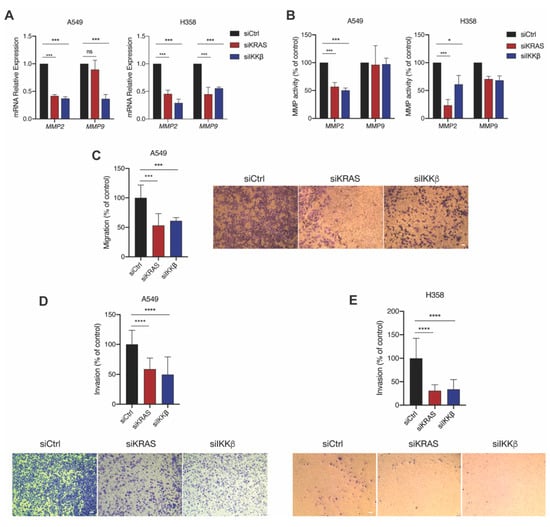siRNA-mediated targeting of IKKβ or KRAS reduces the expression and activity of matrix metalloproteinases, tumour cell migration and invasion. A549 and H358 cells were transfected with a non-targeting control siRNA (siCtrl) or with siRNA SMARTpools targeting KRAS (siKRAS) or IKKβ (siIKKβ) as described in methods. (A) After 72 h, expression of MMP2 and MMP9 was evaluated by RT-qPCR using GAPDH as endogenous control. (B) Conditioned culture medium was collected 96 h post-transfection and matrix metalloproteinase 2 (MMP2) and matrix metalloproteinase 9 (MMP9) activity was determined using ELISA-based Biotrack Activity Assay Systems (GE Healthcare). (C) Transwell cell migration assays were performed as described in methods 96 h post-transfection. Images shown are representative of three independent experiments (n = 3). White scale bar represents 50 µm. (D) Transwell cell invasion assays for A549 and (E) H358 were performed as described in methods 72 h post-transfection. Images shown are representative of three independent experiments (n = 3). White scale bars represent 50 µm. In all cases, bar graphs represent average ±1 SD of three independent experiments (n = 3). Statistical significance was determined by one-way ANOVA with a post hoc Turkey test (* p < 0.05, *** p < 0.001, **** p < 0.0001). Groups being compared are indicated by horizontal bars.