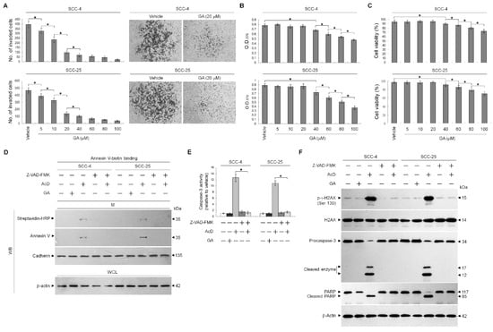 The in vitro invasion assay was performed in triplicate as previously described using transwell chamber units with 8 μm pore polycarbonate membranes [60]. Briefly, approximately 1 × 104 cells were resuspended in 200 μL of serum-free DMEM, seeded into the upper chambers of the Matrigel-coated transwell plates and treated with vehicle or GA. Then, 300 μL of the same medium containing 5% FBS was placed in the lower chamber. After 24 or 48 h incubation periods, cells on the upper surface of the transwell membranes were removed by wiping with a cotton swab, and the cells that had migrated to the lower side of the membrane were stained with a 2% crystal violet solution. For each treatment, 10 randomized fields were counted using a light microscope at 200× magnification. The number of invading cells in each experiment was normalized using the MTT assay (see below) to correct for the effects on cellular proliferation of treatment with vehicle or GA (normalized invading cell number = counted invading cell number/value of OD570).