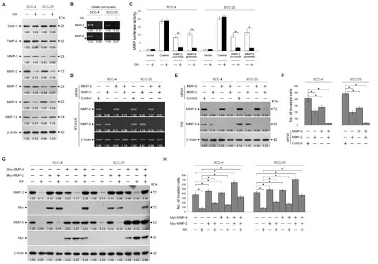 Suppression of tongue squamous carcinoma (TSC) cell invasiveness by gallic acid (GA) involves the downregulation of matrix metalloproteinase-2 (MMP-2) and MMP-9. (A) The effect of GA on MMP-2 and MMP-9 expression. The levels of tissue inhibitor of matrix metalloproteinases-1 (TIMP-1), TIMP-2, MMP-1, -2, -7, -9, and -12 in TSC cell lysates that were prepared after 36 h of treatment with vehicle (−) or GA (20 μM) were analyzed using specific antibodies. (B) At 36 h, the medium from vehicle- or GA (20 μM)-treated TSC cells was collected for analysis of the proteolytic activities of MMP-2 and MMP-9 by gel zymography. (C) The effect of GA on MMP-2 and MMP-9 promoter activities. TSC cells were co-transfected with the MMP-2 promoter and pCH110 plasmids or with the MMP-9 promoter and pCH110 plasmids for 12 h, followed by vehicle or GA (20 μM) for an additional 36 h. The MMP-2 and MMP-9 promoter activities in the cell lysates were determined using the luciferase reporter assay. The values are presented as the means ± standard error (S.E.M.) of three independent experiments. * p < 0.05: significantly different from the vehicle-treated, MMP-2 promoter plasmid-transfected, or MMP-P promoter plasmid-transfected cells. (D–F) Involvement of MMP-2 and MMP-9 in the invasiveness of TSC cells. TSC cells were transfected with the indicated small interfering RNAs (siRNAs) for 12 h followed by treatment with vehicle or GA (20 μM) for an additional 36 h. The levels of MMP-2 and MMP-9 transcripts and proteins in the siRNA-transfected cell lysates were determined by RT-PCR with specific primers and Western blot analysis using specific antibodies, respectively. The values above the figures represent relative density of the bands normalized to β-Actin. The cell invasion activity was determined using the Matrigel invasion assay. * p < 0.05: significantly different from the vehicle-treated, control siRNA-transfected cells. The values are presented as the S.E.M. of three independent experiments. (G,H) The effect of the ectopic expression of the Myc-MMP-2 and Myc-MMP-9 on the suppression of TSC cell invasion by GA. At 1 h after transfection with empty vector, Myc-MMP-2, Myc-MMP-9, or Myc-MMP-2 plus Myc-MMP-9, cells were treated with vehicle (−) or GA (20 μM) for 36 h. The levels of the indicated proteins in the whole cell lysates of transfected cells were determined by Western blot analysis with specific antibodies. The values above the figures represent relative density of the bands normalized to β-Actin. The cell invasion activity was determined using the Matrigel invasion assay. * p < 0.05: significantly different from the empty vector-transfected vehicle-treated cells or empty vector-transfected GA-treated cells. The values are presented as the S.E.M. of three independent experiments.